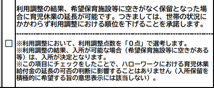 申請の時点で他の方々に迷惑がかからないように「育休延長を容認する」という項目にチェックを入れて申請しました。これで0点で審査にかけられるので空きが無い限りはまず落ちます。
